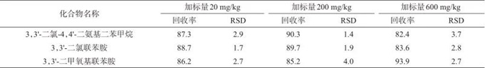 選取空白涂料樣品,分別進(jìn)行了低(20 mg/kg)、中(200 mg/kg)、高(600 mg/kg)共3個含量水平的加標(biāo)回收試驗(yàn),每個加標(biāo)水平行測定6次,計算加標(biāo)回收率和測定值的相對標(biāo)準(zhǔn)偏差,結(jié)果見表3。由表3可知,在添加濃度范圍內(nèi),23種芳香胺的平均回收率為71.2%~101.3%,測定結(jié)果的相對標(biāo)準(zhǔn)偏差為1.2%~9.7%,表明該方法具有良好的精密度和較高的準(zhǔn)確度。低含量水平加標(biāo)回收試驗(yàn)中2,4-二氨基