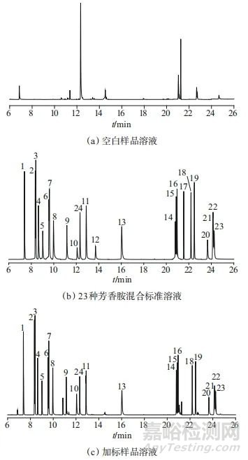 圖6 空白樣品溶液、23種芳香胺混合標(biāo)準(zhǔn)溶液及