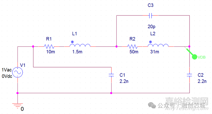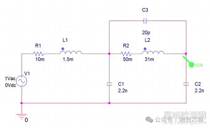 在后面我通過仿真分析,在共模電感中間的Y電容對濾波器的性能的影響,見下圖。現(xiàn)在在該板上使用的共模電感組合是一個繞了40~50圈的共模電感電感量在30mH,另外一個是雙線并繞只繞了15圈的電感,其匝間電容相對來說要小一些。為了簡易的分析濾波器的性能,對大電感量的寄生電容假定為20p,另外一個電感假設沒有電容。現(xiàn)在是仿真Y電容放在兩個共模電感中間的效果: