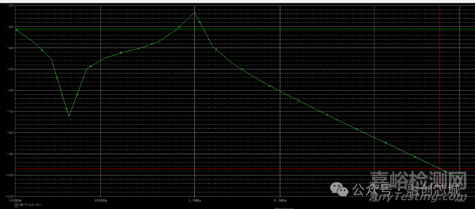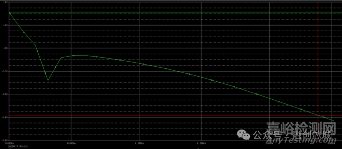 進行頻率響應,起點在100KHZ,結束點到30MHZ,10倍頻掃描,見結果在23M附近有138dB的衰減(實際肯定沒有這么高,我們仿真只是驗證一下理論)。