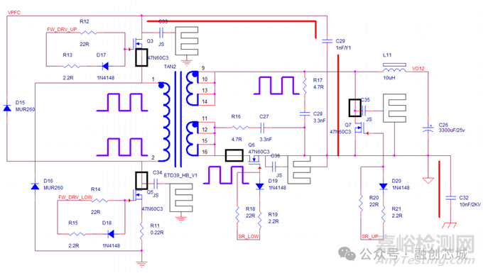 正激部分原邊的MOSFET上,雖然沒有像反激那樣因為漏感在VDS上有強烈的尖峰存在。但是因為正激變壓器也會受到漏感的問題,雖然在VDS的電壓上表現(xiàn)不出來(但是在電流上是可以看到因為漏感引起的尖峰,具體是表現(xiàn)在復位二極管上的電流,可以看到明顯的反向恢復尖峰)。雖然正激的變壓器沒有那么強烈的電壓變化,但是在變壓器內部也是加了屏蔽層。屏蔽層的好處是減弱變壓器內部的寄生電容,減少了原邊繞組流到副邊的干擾電流。