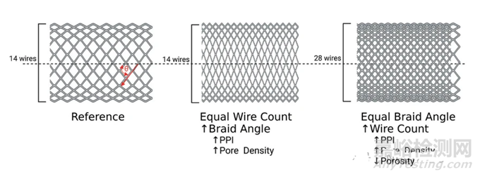 PPI (Pics per Inch),每英寸點數(shù),其定義為沿器械長度,每英寸的金屬絲交叉數(shù)。PPI可以通過增加編織股數(shù)來調(diào)整,也可以改變編織角度來調(diào)整。