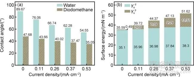 圖1 不同電流密度處理的碳纖維動(dòng)態(tài)接觸角(a)和表面能(b)