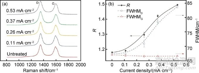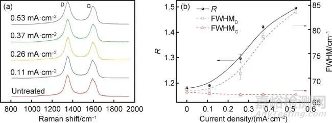 圖2 不同電流密度處理的碳纖維拉曼譜圖(a)和R值及D峰與G峰半高寬(b)