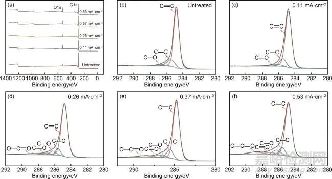 對(duì)不同電流密度處理的碳纖維樣品進(jìn)行了XPS測(cè)試,表征碳纖維表面化學(xué)組成,其全譜圖如圖4(a)所示,各元素含量,列于表1中。陽極氧化處理前的碳纖維本身比較惰性,在不同電流密度下陽極氧化處理后碳纖維表面氧元素含量明顯提高,在電流密度為0.11,0.26,0.37,0.53 mA/cm2時(shí)對(duì)應(yīng)氧元素含量分別為9.35%,8.58%,10.06%,13.78%,說明陽極氧化在碳纖維表面引入大量含氧官能團(tuán),改善了碳纖維的表面惰性。對(duì)C1s譜圖進(jìn)行分峰擬合,得到的擬合圖如圖4(b)~(f)所示。分峰擬合得到的表面官能團(tuán)含量列于表2中,經(jīng)過電解處理后,表面官能團(tuán)含量都明顯提高,而且隨著電流密度增大,羰基、羧基含量都逐漸增加,官能團(tuán)總量整體上呈現(xiàn)上升的趨勢(shì),電解后碳纖維表面的含氧官能團(tuán)含量明顯增加,碳纖維表面活性增強(qiáng)。