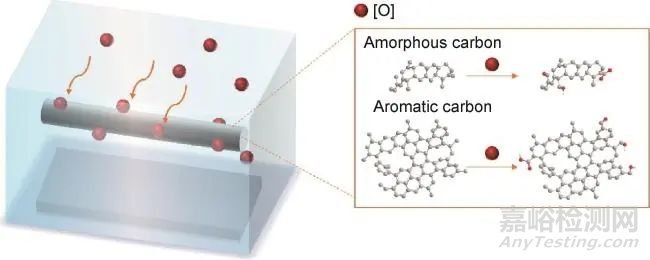 根據(jù)拉曼測(cè)試的結(jié)果和XPS分峰擬合的結(jié)果,推測(cè)出陽極氧化過程的內(nèi)在機(jī)理。在陽極氧化過程中,陽極板附近產(chǎn)生的活性氧原子在硫酸溶液中擴(kuò)散,運(yùn)動(dòng)到碳纖維表面,首先進(jìn)攻最薄弱的無定型碳,氧化生成羥基、羰基和羧基;其次有一定面積的片狀芳香環(huán)結(jié)構(gòu)比無定型碳更穩(wěn)定,但不如石墨碳穩(wěn)定,是活性氧進(jìn)攻的另一個(gè)對(duì)象,如圖5所示。