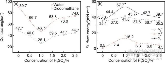 圖6 不同濃度硫酸處理的碳纖維動(dòng)態(tài)接觸角(a)和表面能(b)