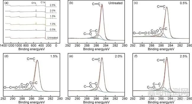 圖9 不同濃度硫酸處理的碳纖維XPS全譜(a)和XPS C1s分峰擬合譜圖(b)~(f)