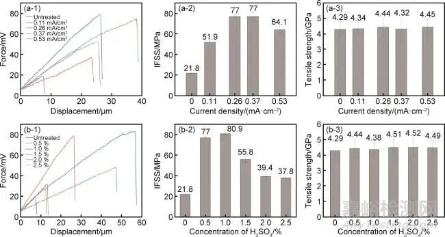 圖10 不同電流密度(a)和不同濃度硫酸(b)處理的碳纖維力-位移曲線(1)、界面剪切強(qiáng)度(2)及單絲拉伸強(qiáng)度(3)