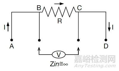 圖1 使用電阻器R和相關(guān)壓降V(B-C處)來測量電流I(從A到D)的原理很簡單,但也存在著一些必須承認(rèn)的微妙之處。當(dāng)電流在100毫歐范圍及以下時(shí),通常使用四線高阻抗開爾文檢測。資料來源:Vishay Intertechnology via Eastern States Components