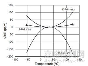 圖3 三種不同金屬箔電阻器(及其推出年份)的電阻-溫度特性顯示出了不同的TCR非線性。資料來源:Vishay Intertechnology