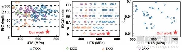 圖1. 高強(qiáng)高耐蝕7075鋁基復(fù)合材料優(yōu)異的耐晶間腐蝕、剝落腐蝕和應(yīng)力腐蝕性能
