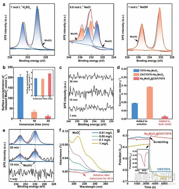 受魚類在受到外部刺激時(shí)會(huì)通過腺體自發(fā)分泌粘液來進(jìn)行自我保護(hù)的自然現(xiàn)象啟發(fā),王政彬提出了“內(nèi)生沉淀劑為粘液,中空碳納米管為腺體,毛細(xì)作用為分泌驅(qū)動(dòng)力”的仿生設(shè)計(jì)策略,成功制備出高強(qiáng)高耐蝕的塊體7075鋁基復(fù)合材料,抗拉強(qiáng)度高達(dá)~700 MPa,耐晶間腐蝕、剝落腐蝕和應(yīng)力腐蝕性能優(yōu)異,其強(qiáng)度和耐蝕性的綜合匹配超過了目前公開報(bào)道的其他鋁合金(圖1)。該材料在酸、堿、鹽環(huán)境中均具有極低的腐蝕速率(圖2),在強(qiáng)腐蝕性堿性介質(zhì)中的腐蝕速率甚至比最耐蝕的純鋁還低133倍。優(yōu)異的耐蝕性主要是因?yàn)槊?xì)作用誘導(dǎo)沉淀劑自發(fā)從碳納米管中溶出并在表面富集,形成保護(hù)性膜層(圖3)。運(yùn)用上述仿生策略同樣研制出了兼具高強(qiáng)高耐蝕的2024以及6061鋁基復(fù)合材料,表明該策略具有可拓展性,有望能研發(fā)出其他高強(qiáng)高耐蝕金屬材料。