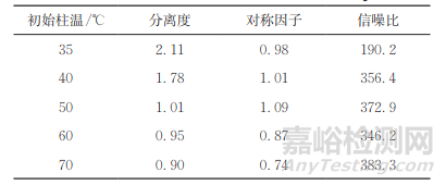 表2 乙腈在不同初始柱溫下的分離度、對稱因子和信噪比