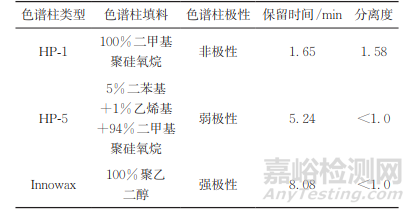表1 乙腈在不同石英毛細(xì)管色譜柱上的保留時(shí)間和分離度
