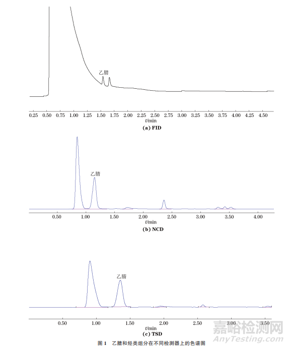 由圖1可知:丁二烯及烴類組分在FID上對乙腈的干擾大;而NCD和TSD對乙腈的選擇性更高,對烴類組分的響應(yīng)低,甚至對低濃度水平的烴類組分無響應(yīng),因此烴類組分在這兩種檢測器上對乙腈的干擾小。