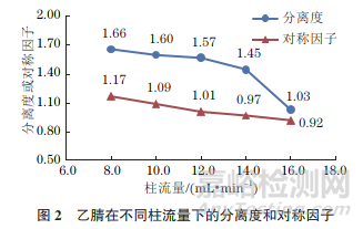 柱流量對目標(biāo)組分分離效果影響較大,柱流量過小使目標(biāo)組分出峰較慢,分析時(shí)間過長,甚至導(dǎo)致峰形變寬,信噪比降低;柱流量過大會導(dǎo)致樣品中目標(biāo)組分難以分離,柱流失加快,色譜峰變形。由于NCD在高真空狀態(tài)下工作時(shí),反應(yīng)室內(nèi)部為負(fù)壓狀態(tài),為減小色譜峰展寬,提高檢出限,柱流量應(yīng)控制在8~16mL·min−1內(nèi),因此試驗(yàn)考察了柱流量(8.0,10.0,12.0,14.0,16.0mL·min−1)對乙腈分離度和色譜峰對稱性的影響,結(jié)果見圖2。