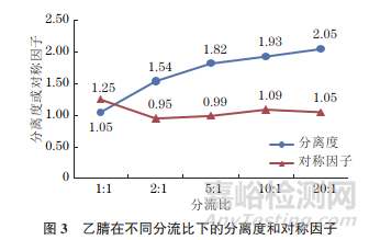 分流比是組分定量時(shí)的一個(gè)關(guān)鍵參數(shù),分流比過小會導(dǎo)致進(jìn)樣量過高,色譜柱超載,出現(xiàn)平頭峰,且主峰后面的色譜峰會被覆蓋,造成分離度下降,色譜峰拖尾甚至變形,還會影響色譜柱使用壽命;而分流比過大使進(jìn)入色譜柱的樣品量減少,導(dǎo)致難以檢測微量組分或測定下限偏高。試驗(yàn)考察了分流比(1∶1,2∶1,5∶1,10∶1,20∶1)對乙腈分離度和色譜峰對稱性的影響,結(jié)果見圖3。