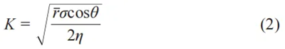 式中:H為吸液高度;t為吸液時間;r-為形式半徑;σ為液體的表面張力;Θ為接觸 角;η為液體粘度 。由Lucas -Washburn方程可以看出,液體浸潤高度H的平方和吸液時間t成正比,定義浸潤高度H的平方和吸液時間t的比率K為浸潤速率。其中r-與毛細(xì)管形狀系數(shù)c和平均毛細(xì)管半徑r相關(guān),如公式(3)所示: