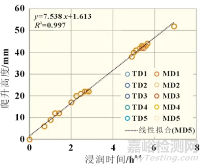 取磷酸鐵鋰正極片10個,分別在橫向(TD)和縱向(MD)方向進行不同時間的浸潤爬升測試,得到如圖2所示數(shù)據(jù)??梢园l(fā)現(xiàn)在不同吸液方向TD/MD下,不同的爬升高度和浸潤時間t0.5成線性關(guān)系,且擬合 R2為 0.997,精度較好。另外,TD 方向5個樣品、MD方向5個樣品重合性較好,證明極片TD和MD方向浸潤無差異。裝置整體可靠性較好。浸潤高度和時間關(guān)系符合 Lucas-Washburn公式。