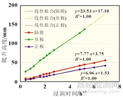 將樣品用雙面膠固定在圖1(b)所示的隔板上下兩端的凹槽中,固定過程需保證樣品拉直無彎曲,再將固定有樣品條的隔板緩慢放入殼體內(nèi),記錄時間和液面高度對應(yīng)刻度。隔板每條凹槽左邊都設(shè)計有刻度線,分度為0.5mm,作為浸潤實驗的起點,再緩慢移出移液管并用橡膠塞密封注液孔。后續(xù)每隔一定的時間對極片內(nèi)爬升電解液的高度ΔH進行記錄,同時記錄下對應(yīng)的時間t。最后得到電解液在特定樣品內(nèi)的爬升高度和時間的關(guān)系。實驗環(huán)境需要控制在較低的濕度2%條件下,可用帶有溫度控制的水域鍋精準(zhǔn)控制溫度。