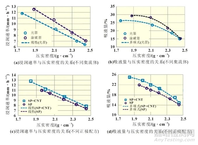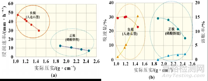 極片壓實密度是電芯的關(guān)鍵設(shè)計參數(shù)。不同的壓實密度對應(yīng)不同孔隙率,對電池性能有關(guān)鍵的影響。對正負(fù)極極片在不同壓實密度下進行電解液浸潤速率和吸液量的測試,得到圖4所示結(jié)果。