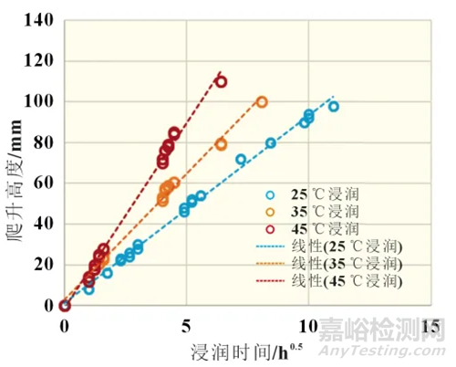 圖6 不同溫度下電解液在相同隔膜內(nèi)的爬升高度和浸潤時間的關(guān)系