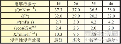 表1 四種不同的電解液的性質(zhì)參數(shù)和浸潤速率