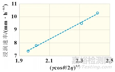 選取四種不同性質(zhì)的電解液,編號如表1所示。在相同的磷酸鐵鋰正極片內(nèi)浸潤爬升。此正極片的面密度為164g/cm2,壓實密度為2.3g/cm3。得到爬升速率和電解液性質(zhì)如圖7所示,包括表面張力γ、接觸角Θ、電解液粘度η之間的關(guān)系。