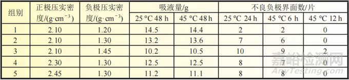 選取2.4 節(jié)中相同面密度、不同壓實密度的正負(fù)極極片,隔膜為常規(guī)12μm PE隔膜,組成4Ah的軟包裝疊片電池,層數(shù)為26層正極、27層負(fù)極。首先對干電芯進行吸液實驗,吸液時間為48h,溫度分別為25和45℃,得到不同組別的吸液量。再對剩余電池進行注液,注液量均保持為(15±0.5) g,然后在不同的條件下(25℃ 24h、45℃ 6h、45℃ 12h)浸潤,最后對電池進行化成,滿充拆解界面。統(tǒng)計不同組別的不良負(fù)極界面(黑斑,析鋰)的數(shù)量。