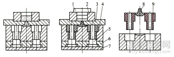 1-柱塞 2-加料室 3-上模座 4-凹模 5-凸模6-凸模固定板 7-下模座 8-澆注系統(tǒng)9-制品