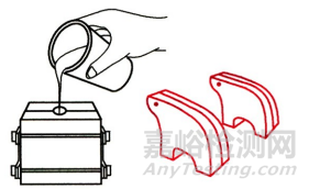 又稱澆鑄成形,是將加有固化劑和其他輔助劑的液態(tài)樹脂混合物料倒入成形模具中在常溫或加熱條件下使其固化而成為具有一定形狀制品的方法。鑄塑成形法的優(yōu)點是工藝簡單,成本低,制品尺寸不受限制,可生產(chǎn)形狀簡單、尺寸精度不高的大型產(chǎn)品,適用于流動性大同時又具有收縮性的塑料,如有機玻璃、尼龍、聚酰胺、酚醛樹脂、環(huán)氧樹脂等。缺點是成形周期長,制品尺寸的精確性較差等。圖7為鑄塑成形示意圖。