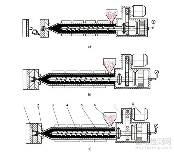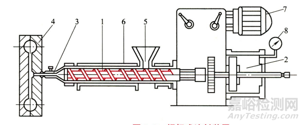 1-模具 2-噴嘴3-加熱器 4-注射料簡 5-螺桿6-加料斗 7-注射液壓缸 8-電動機及傳動系統(tǒng)