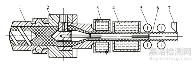 1-擠出料簡 2-機頭 3-定徑裝置4-冷卻裝置5-牽引裝置6-塑料管 7-切割裝置