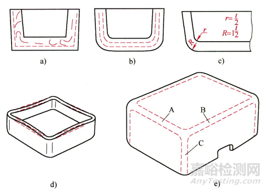 a)沒有R的亂流b)有R時的順暢流動c)理想的圓角d)成形品的內(nèi)縮現(xiàn)象 e)三條棱線之間角的處理規(guī)則