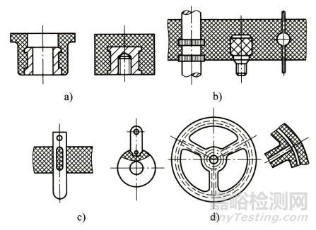 a)圓形嵌件 b)帶臺階圓柱形嵌件c)片狀嵌件 d)細桿狀貫穿嵌件