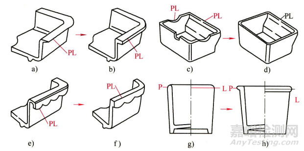 陰模與陽模的接合線稱為分模線(Parting Line,縮寫為 PL),位于產(chǎn)品的外圍。設(shè)計分模線時應(yīng)注意:盡量設(shè)計在不顯眼的位置,以便隱藏產(chǎn)品表面分模線的痕跡;盡量設(shè)計在最外側(cè)的棱邊上,以便清除飛邊;盡量使其形狀簡潔,以便提高模具閉合時的配合精度。圖15為不同制品的分模線。