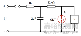 脈沖擊穿電壓一般在1000(1±10%)V/us的電壓上升率下測量該電壓值,測量GDT的脈沖擊穿電壓時(shí),采用上圖所示的電路進(jìn)行測量,電壓上升率為1000(1±10%)V/us。每種極性下,GDT的A極、C極之間的兩次測量都要記錄,兩次測量的時(shí)間間隔應(yīng)不小于1S,對于三極GDT的每對端子分別測量,而另外的電極懸空。