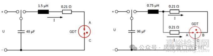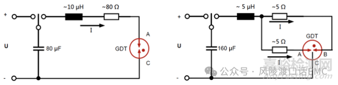 測量時(shí),施加的沖擊電流數(shù)值大小根據(jù)GDT規(guī)格書確定,對于兩極的GDT,產(chǎn)生8/20us波形的試驗(yàn)電路如上圖左圖所示,沖擊電流測量應(yīng)有足夠長時(shí)間間隔不至于GDT內(nèi)部發(fā)熱。對于三極GDT,每個(gè)電極應(yīng)同時(shí)向公共電極放電如上圖左圖所示,各自標(biāo)稱沖擊電流的規(guī)定值如規(guī)格書,完成規(guī)定的電流次數(shù)后,測量GDT直流擊穿電壓、脈沖擊穿電壓及絕緣阻抗應(yīng)符合規(guī)格書所規(guī)定的值。
