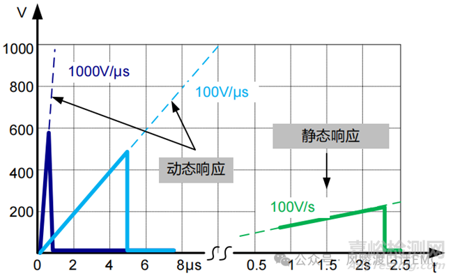 脈沖擊穿電壓的選取要考慮浪涌測試等級,一般浪涌測試波形的上升時(shí)間為微秒級的脈沖波形,如8/20us電流波和10/700us電壓波,與GDT脈沖擊穿電壓測量電壓上升速率1000V/us為一個(gè)數(shù)量級,例如采用10/700us的波形測試4000V,GDT的脈沖擊穿電壓要小于4000V,這樣在測試時(shí)GDT才能導(dǎo)通。下圖為GDT在不同電壓上升速率下的導(dǎo)通狀態(tài)示意圖,從圖中可以看出電壓上升速率越高,GDT的擊穿電壓也越高。