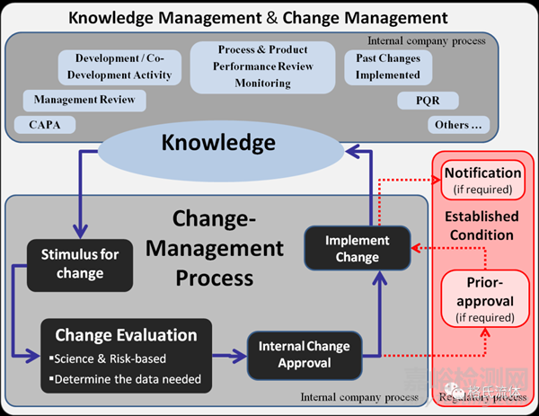 3)藥物在獲得上市批準(zhǔn)后或者是完成某個變更后并非一勞永逸,需要基于團(tuán)隊內(nèi)不斷更新的知識(產(chǎn)品認(rèn)知、工藝了解、最新法規(guī)指南了解等)進(jìn)行持續(xù)的變更,對于藥物的變更管理實(shí)行動態(tài)管理的方式。(參見知識管理與變更管理的關(guān)系圖--From ICH Q12)