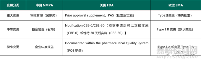 如下是不同法規(guī)市場對于變更分類對應(yīng)關(guān)系表格: