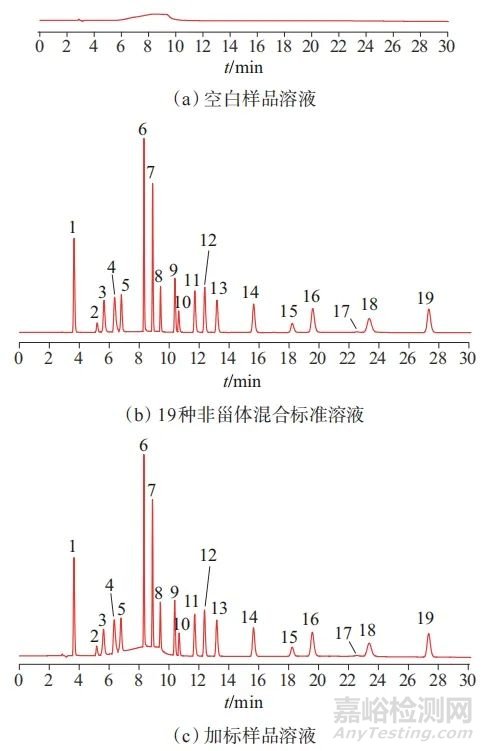 分別取空白樣品溶液、19種非甾體混合標(biāo)準(zhǔn)溶液及加標(biāo)樣品溶液,按1.3色譜條件進(jìn)行測(cè)定,色譜圖如圖1所示。圖1結(jié)果表明,空白樣品溶液無(wú)干擾,加標(biāo)樣品溶液中19種非甾體物質(zhì)的保留時(shí)間與混合標(biāo)準(zhǔn)溶液中19種非甾體物質(zhì)保留時(shí)間一致,19種非甾體物質(zhì)的分離效果和峰型均良好,表明該方法具有良好的專屬性。