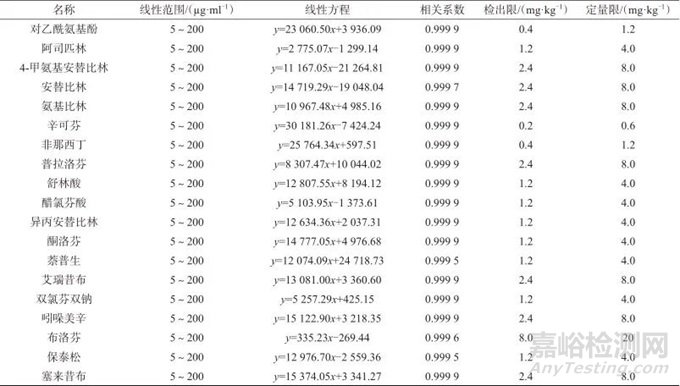 取19種非甾體抗炎藥系列標(biāo)準(zhǔn)工作溶液,按1.3儀器工作條件進(jìn)行測(cè)定,以標(biāo)準(zhǔn)溶液各組分質(zhì)量濃度(x,µg/mL)為橫坐標(biāo),相應(yīng)色譜峰面積(y)為縱坐標(biāo)繪制標(biāo)準(zhǔn)工作曲線,得到各組分的線性方程與相關(guān)系數(shù),結(jié)果見表2。取質(zhì)量濃度為5 μg/mL混合標(biāo)準(zhǔn)溶液進(jìn)行逐級(jí)稀釋并檢測(cè),分別以3倍信噪比(S/N)和10倍信噪比(S/N)對(duì)應(yīng)的質(zhì)量濃度作為方法檢出限和定量限,根據(jù)樣品取樣質(zhì)量為1.0 g,稀釋10倍體積換算為樣品中的含量,以質(zhì)量分?jǐn)?shù)表示。19種非甾體抗炎藥的質(zhì)量濃度線性范圍、線性方程、相關(guān)系數(shù)、檢出限及定量限見表2。