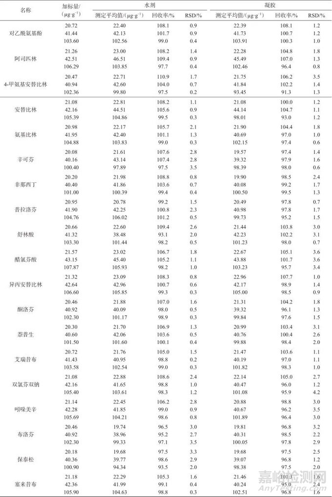 選取空白樣品的水劑和凝膠基質(zhì),分別加入適量的19種非甾體抗炎藥混合標(biāo)準(zhǔn)溶液,按1.4方法制備3種不同質(zhì)量濃度水平的加標(biāo)樣品溶液,每個(gè)加標(biāo)水平平行測(cè)定6次,計(jì)算回收率和測(cè)定結(jié)果的相對(duì)標(biāo)準(zhǔn)偏差,結(jié)果見表3。由表3可知,在水劑和凝膠基質(zhì)中的平均回收率分別為93.1%~110.9%和91.3%~108.1%,測(cè)定結(jié)果的相對(duì)標(biāo)準(zhǔn)偏差分別為0.2%~3.5%和0.6%~4.2%。表明該方法在水劑和凝膠兩種基質(zhì)中均具有良好的準(zhǔn)確度和精密度。