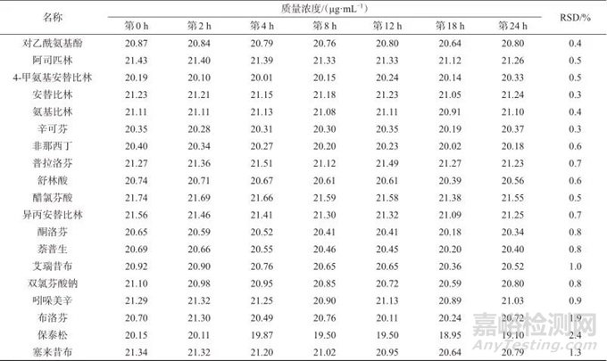 在一定條件下,有些非甾體不穩(wěn)定,會(huì)發(fā)生降解或分解,從而影響定量結(jié)果的準(zhǔn)確性。對(duì)19種非甾體進(jìn)行日間(24 h)穩(wěn)定性考察。取質(zhì)量濃度為20 μg/mL的同一19種非甾體標(biāo)準(zhǔn)溶液,每隔一段時(shí)間進(jìn)行測(cè)定,計(jì)算各組分在不同時(shí)間點(diǎn)的質(zhì)量濃度,并計(jì)算相對(duì)標(biāo)準(zhǔn)偏差(RSD),結(jié)果見表4。由表4可知,在24 h內(nèi)19種非甾體標(biāo)準(zhǔn)溶液的質(zhì)量濃度無(wú)太大變化,測(cè)定結(jié)果的相對(duì)標(biāo)準(zhǔn)偏差為0.3%~2.4%,表明在室溫條件下標(biāo)準(zhǔn)溶液在24 h內(nèi)穩(wěn)定性良好。