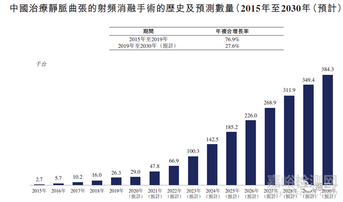 據(jù)以下市場分析圖,國內(nèi)靜脈曲張的射頻消融正處在上升期,未來十年手術(shù)量的CAGR在27.6%,預(yù)計在2030年手術(shù)量達(dá)到38.4萬臺。