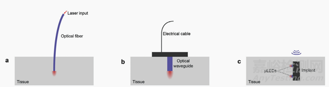 圖1.三類光電植入物的說明,代表(a)系統(tǒng),其光源在體外,通過光纖傳輸;b)附著在皮膚上的植入物,通常有線傳輸電能;c)植入物在體內,利用無線傳輸為光源供電。