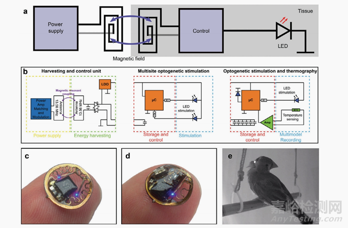 圖2.電感耦合的能量傳遞。a)電感耦合的基本工作原理。功率放大器向發(fā)射線圈提供一個交流電,該發(fā)射線圈產生一個磁場,在接收線圈中產生一個電流,這屬于植入裝置。在電子轉換后(例如,電容器或整流器)后,產生的直流電為系統(tǒng)供電,通常由一個或多個led組成。b)Ausra等人開發(fā)的多位點光遺傳學、結合光遺傳學和熱成像學的植入物電氣示意圖。[66]c)Ausra等人的多位點光遺傳植入照片[66])斑胸草雀在實驗刺激時可見紅外LED的照片。[66].b-e)經許可復制;[66]版權所有2021,Ausra等人。