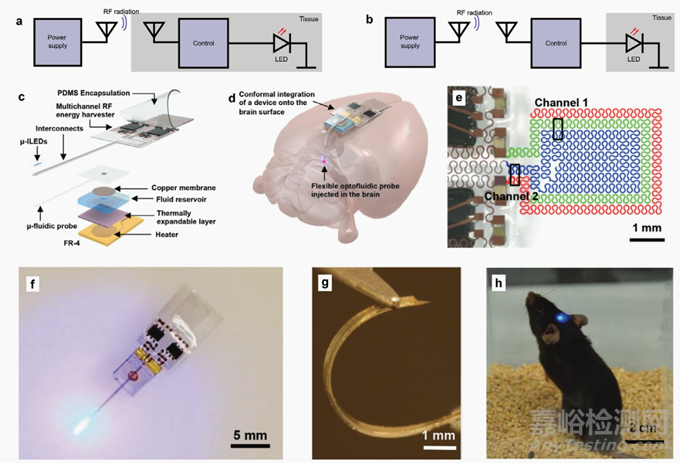 圖3.輻射能量轉移。a、b)輻射能量傳遞的基本工作原理。能量通過主天線輻射傳輸,并由二次天線接收,其在組織外分別為(a)或(b)。所產生的電流用于為系統(tǒng)供電。c)Noh等人結合光遺傳學和微流控藥物傳遞的爆炸視圖。[79] d)植入嚙齒類動物大腦的光流控裝置的說明。[79] e)用于控制光流控裝置的具有兩個獨立通道的可伸縮天線的假彩色照片。[79] f)設備在射頻信號下的照片,LED打開參考文獻。[79] g)放大探頭的光學圖像,顯示其靈活性。h)將光流控裝置植入到其顱骨上的小鼠的照片。[79]c-h)經許可復制;[79]版權所有2017,WILEY-VCH Verlag GmbH有限公司。